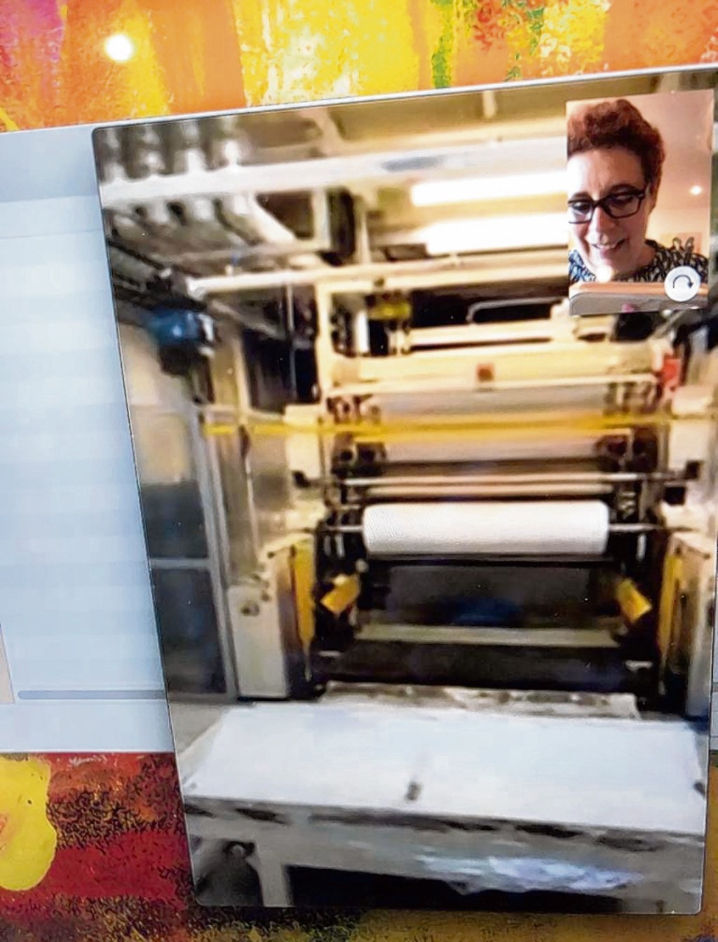 Wem zuliebe setzt Krumme eine Maske auf, als er durch die Produktion führt? Er dreht das Smartphone und zeigt uns, dass hier tatsächlich nicht nur Maschinen, sondern auch Menschen arbeiten. Sie stehen am Leitstand, überwachen die Prozessparameter, sie nehmen die Rollen ab. Wenn ein Wickel fertig ist, muss Platz gemacht werden für den nächsten. „Wir rechnen mit 1,5 Menschen pro Anlage.“