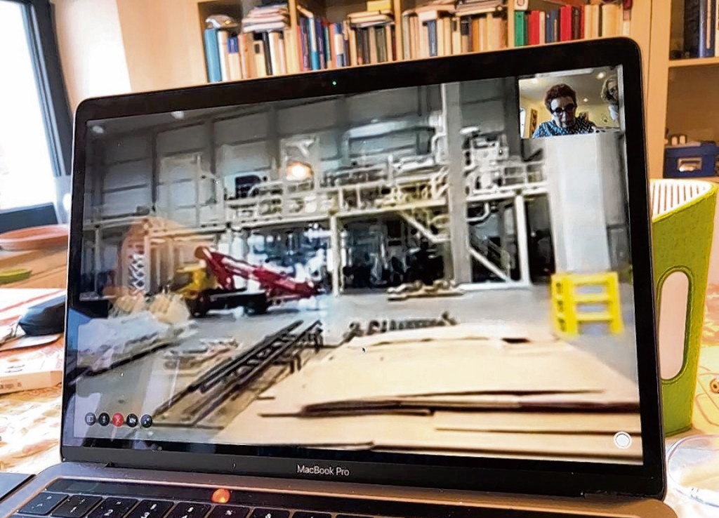 Wir treten via Bildschirm gemeinsam in die neue Halle ein. Hier erst werden die Dimensionen sichtbar. Menschen verschwinden, die Autos der Monteure und selbst der große Hebebühnenwagen werden zu Spielzeugfahrzeugen. Der Schwerlaststapler hat gerade einen großen Lüftungskanal auf der Gabel. Noch füllen Montagecontainer der Aufbautrupps und Rohre die Halle. Je nach Bedarf wird auch ein Schwerlastkran in die Halle gefahren, der dann bis zu 10 t schwere Teile auf die Bühnen heben kann.
