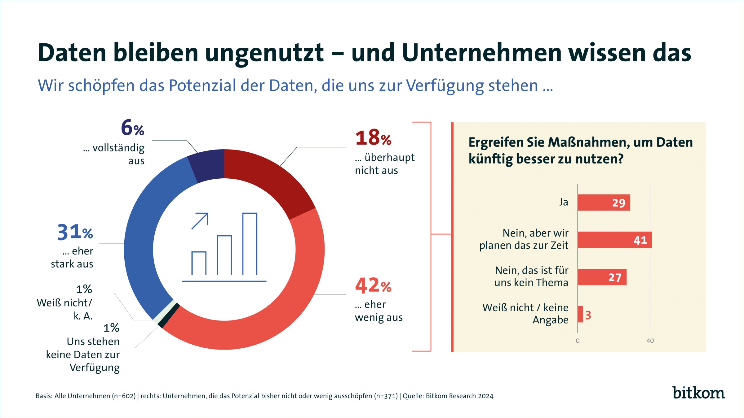 Ob für das Training von KI-Modellen, die smarte Nutzung erneuerbarer Energien oder die Forschung rund um personalisierte Medikamente – Daten werden für Wirtschaft und Gesellschaft immer wichtiger. Doch in der großen Mehrheit der deutschen Unternehmen bleiben Daten weiterhin ungenutzt. Nur 6 % gehen davon aus, dass sie das Potenzial der ihnen zur Verfügung stehenden Daten vollständig ausschöpfen. 31 % schöpfen es eher stark aus, 42 % eher wenig und 18 % meinen, dass sie das Potenzial überhaupt nicht ausschöpfen.