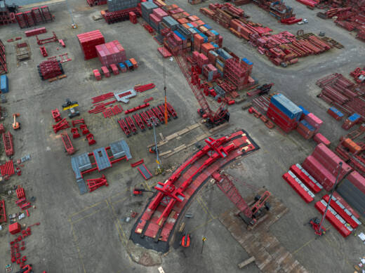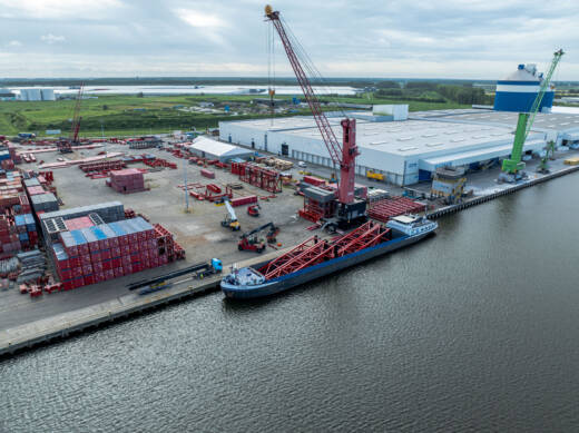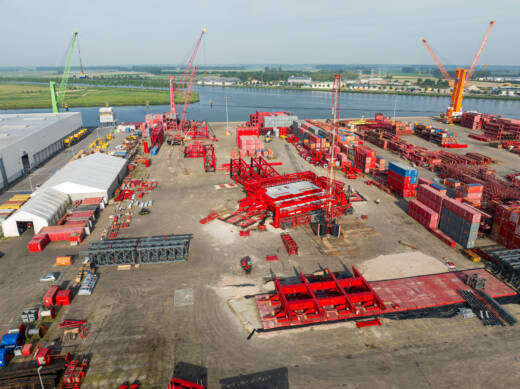 Aktuell läuft am Mammoet-Standort Westdorpe die Montage des Grundrahmens, der Aggregate und des Kontrollraums. Hilfskrane von Mammoet unterstützen den Bau, darunter zwei 250-t-Raupenkrane und ein 140-t-Gottwald-Hafenmobilkran.