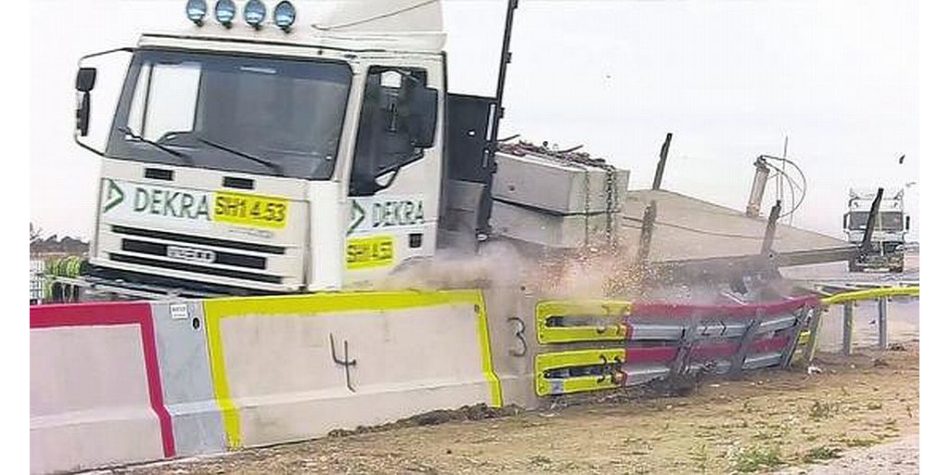 Am südlichen Ende der Anlage sind seit den frühen Morgenstunden Marcus Gärtner, Versuchsingenieur des Dekra-Crashtest-Zentrums, und sein Team mit letzten Vorbereitungen für einen Crashtest beschäftigt, der auch für sie nicht alltäglich ist: Ein 10 t schwerer Iveco-Lkw vom Typ Euro Cargo wird mit 70 km/h im Winkel von 15 Grad in die eigens hierfür auf installierte, insgesamt mehr als 90 m lange Schutzeinrichtung prallen. Sie besteht aus 52 m Stahlschutzplanken, einer 17,6 m langen Übergangskonstruktion und der sich anschließenden 20,9 m langen Betonschutzwand in Ortbetonbauweise. Beton also, der erst auf der Baustelle verarbeitet wird und dort abbindet.