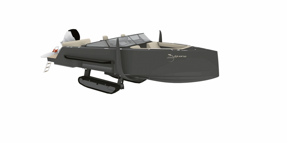Amphibienfahrzeuge gelten als schwerfällig und langsam. Die französische Werft Iguana Yachts beweist mit ihren Motorbooten das Gegenteil: Auf dem Wasser erreichen die offenen, bis zu 9,1 m langen und 3,1 m breiten Flitzer Geschwindigkeiten bis zu 40 kn (ca. 75 km/h), obwohl im Rumpf ein schwerer, ausfahrbarer Landantrieb mit Laufketten steckt, mit dem das Boot auf den Strand zuckeln kann. Die Lösung der Franzosen: Zwei ausklappbare Flügel an der Seite – sogenannte Foils – heben das Boot schon bei langsamer Fahrt aus dem Wasser. Das 10 m lange Electric Iguana ist mit seinem 220 kW starken Elektroantrieb bis zu 30 kn (ca. 65 km/h) schnell.
