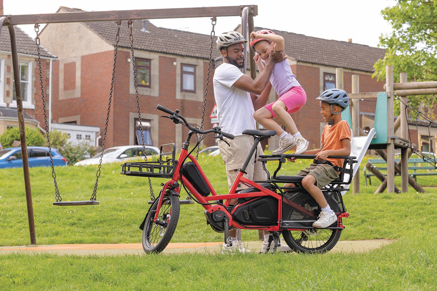 Der Name des neuen Cargobikes von Tern ist fast so lang gezogen wie das Gefährt selbst: „Quick Haul Long“ heißt das kompakte Modell mit Elektroantrieb, das für besonders schwere Transportaufgaben konzipiert ist. Zwei Kinder oder ein Erwachsener bzw. eine Zuladung bis zu 90 kg finden auf dem Heck Platz. Zulässig sind mit Fahrer 190 kg Gesamtgewicht. Besonders in der Stadt hat das Lastenrad Vorzüge: Aufrecht gestellt kann es in Aufzüge gerollt oder auf engem Raum geparkt werden. Mit wenigen Handgriffen lässt es sich auf die jeweilige Körpergröße (1,55 m bis 1,85 m) anpassen. Dazu gibt es Transportmodule. Das Lastenrad soll ab August zum Preis ab 4099 € erhältlich sein.