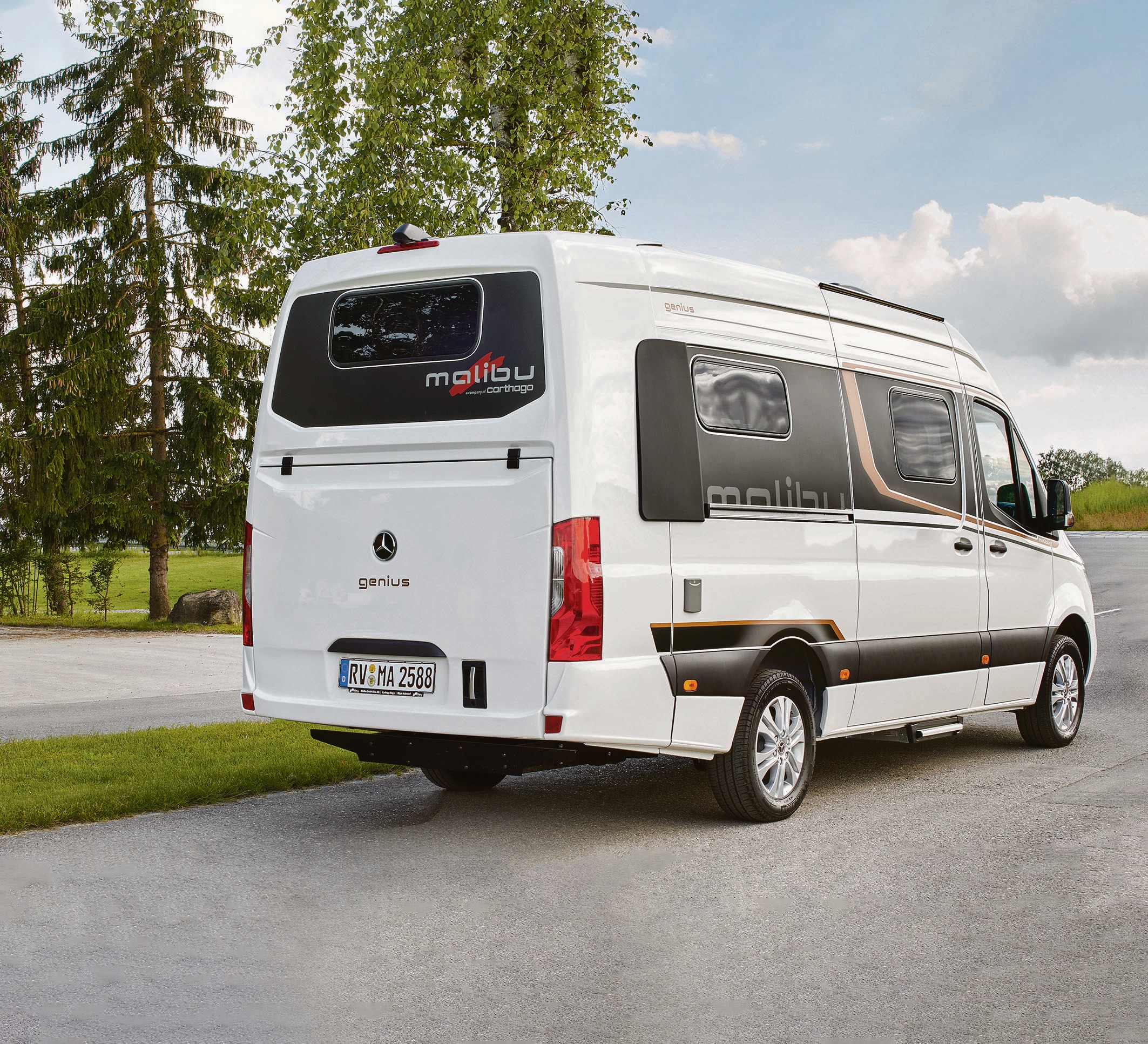 Der Malibu genius 641 LE der Carthago Gruppe, basierend auf dem Mercedes-Benz Sprinter, erreicht mit einer speziellen Heckverlängerung, der „Heck-Extension“, eine Länge von 6,41 m und bietet so viel Reise- und Wohnkomfort auf kompakter Fläche. Die Heck-Extension besteht aus einem isolierten GfK-Sandwich und ist mit der Originalkarosserie verschraubt, was zu einem nahtlosen Erscheinungsbild führt. Innen bietet der kompakte Van dadurch ein großzügiges Raumgefühl, das an teilintegrierte Reisemobile erinnert. Der Preis für den Campervan beginnt bei 93.000 €.