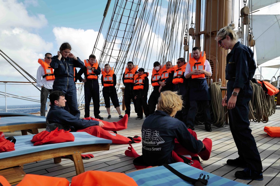 Die scheinbar lustigen Kostüme haben einen ernsten Hintergrund: Es sind Überlebensanzüge, die die Menschen an Bord im Falle einer Havarie auch in kaltem Wasser über viele Stunden schützen können. Und Sicherheit geht auf diesem Großsegler vor: Obwohl die Crew zum großen Teil schon seit vielen Monaten an Bord ist, muss sie auf jeder Reise erneut einen sogenannten Drill – die große Sicherheitsübung – absolvieren. Und dazu zählt eben auch das Anlegen der Überlebensanzüge.