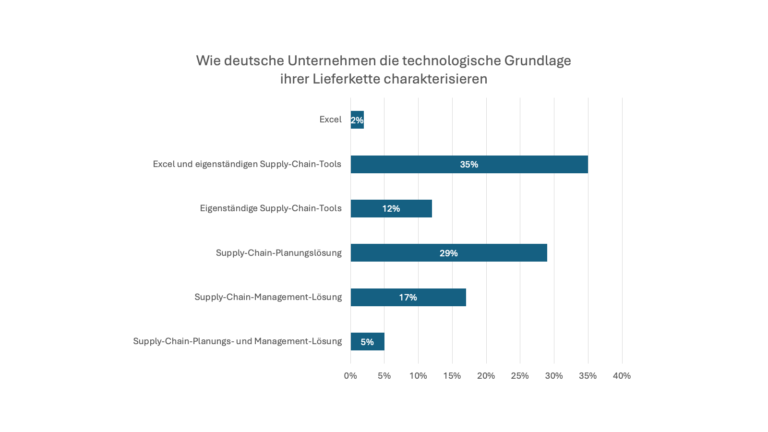 Demnach setzt mehr als ein Drittel der deutschen Unternehmen (37 %) als technologische Grundlage für ihre Lieferkettenplanung noch rein auf Excel oder auf eine Kombination mit eigenständigen Supply-Chain-Tools. Weltweit nutzen durchschnittlich nur 18 % Excel, in den USA 8 % und in Indien sogar nur 3 %.