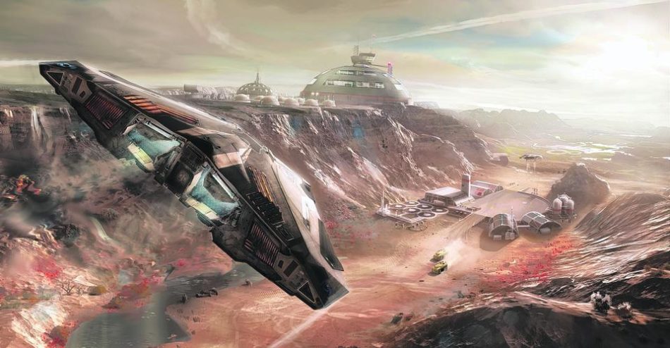 Das Raumschiff beschleunigt und taucht kurz darauf in die Atmosphäre des Planeten ein, durchsticht Wolken und fliegt schließlich über eine fremde Welt, auf der Suche nach einem geeigneten Landeplatz.