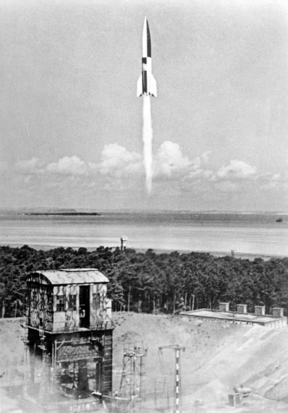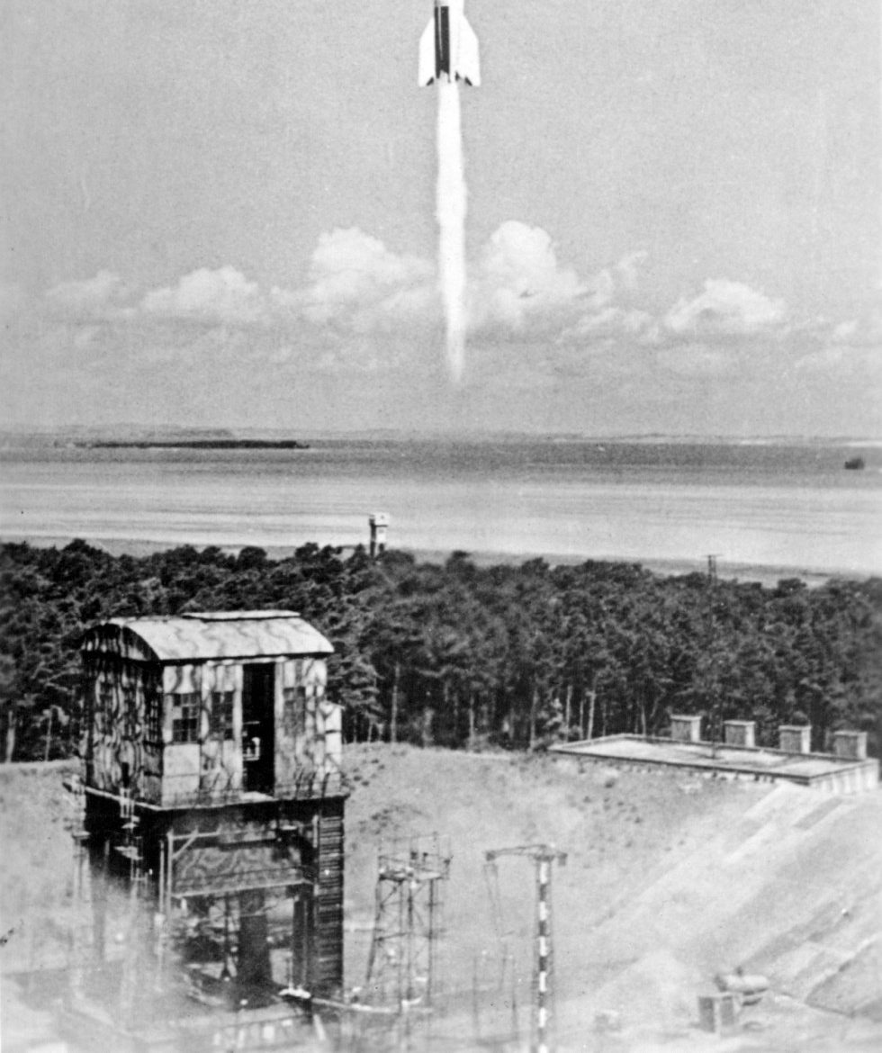 Die deutsche Aggregat 4 (A4) gilt als weltweit erste Rakete mit Flüssigtriebwerk. Entwickelt wurde sie in der Heeresversuchsanstalt Peenemünde unter der Leitung von Wernher von Braun. Der erste Start erfolgte am 13. Juni 1942, der erste erfolgreiche Flug am 3. Oktober 1942. Dieser Start mit 84,5 km Gipfelhöhe gilt als erster Schuss ins All. Nach dem Flug hielt laut dem Historisch-Technischen Museum Peenemünde der Walter Dornberger alsl Leiter der Raketenabteilung des Heereswaffenamtes eine kurze Ansprache in Peenemünde: „Wir haben mit unserer Rakete in den Weltraum gegriffen und zum ersten Mal diesen Weltraum als Brücke zwischen zwei Punkten auf der Erde genutzt. Wir haben bewiesen, daß der Raketenantrieb für die Raumfahrt brauchbar ist. Neben Erde, Wasser und Luft wird künftig auch der unendliche Raum Schauplatz eines Kontinente verbindenden Verkehrs sein und als solcher politische Bedeutung erlangen können. Dieser 3. Oktober 1942 ist der erste Tag eines Zeitalters neuer Verkehrstechnik. Es ist der Beginn der Raumschiffahrt." Von den Nazis wurde die Rakete als „Vergeltungswaffe 2“ (V2) bezeichnet und militärisch genutzt. Die Produktion der Waffe kostete bis zu 20 000 Häftlinge des KZ Mittelbau-Dora das Leben, weitere 8000 Menschen starben durch Raketeneinschläge. Von Braun entwickelte nach dem Zweiten Weltkrieg in den USA die Mondrakete Saturn V. har