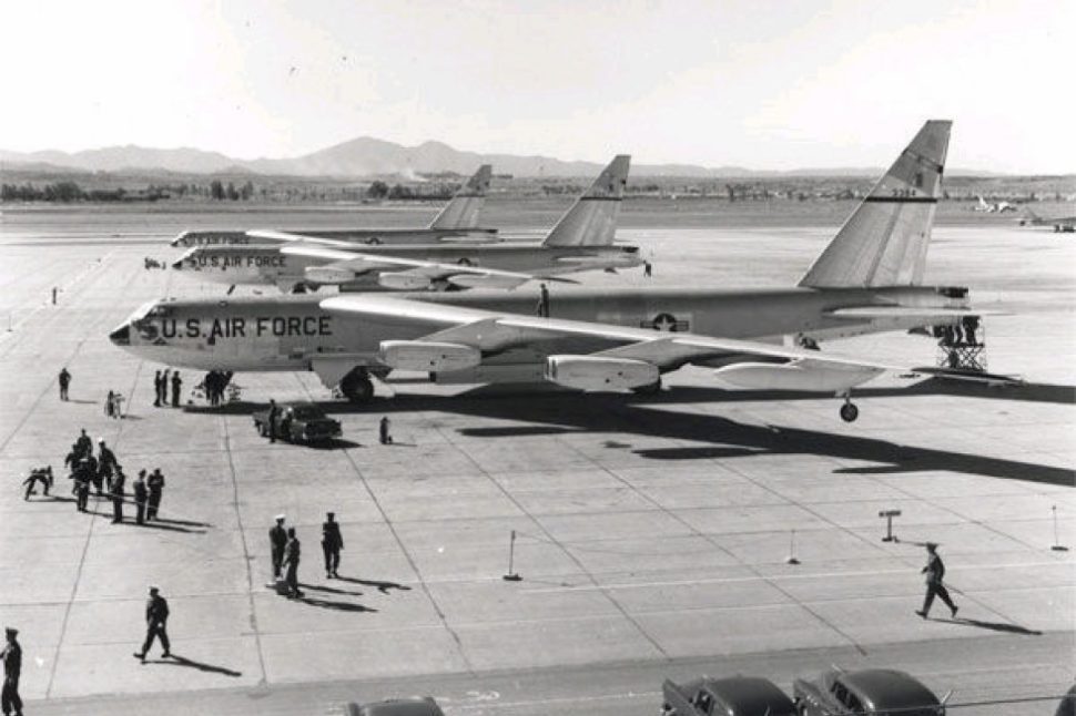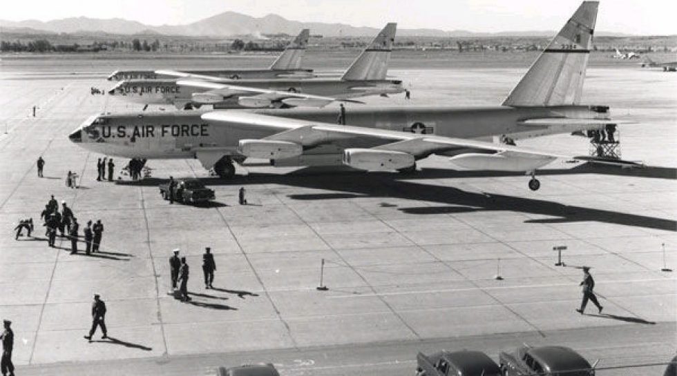 Am 16. Januar 1957 starteten drei Boeing B-52 Stratofortresses zum ersten Nonstop-Flug strahlgetriebener Flugzeuge um die Erde. Als die übermüdeten Besatzungen ihre Bomber nach 45 Stunden und 19 Minuten wieder auf der Castle Air Force Base in Kalifornien aufsetzten, hatten sie ihren Auftrag erfüllt. Möglich geworden war der Langstreckenrekord durch die wiederholte Luftbetankung der Flugzeuge, die die US Air Force in den 1950er Jahren für ihre Atombomber perfektioniert hatten. Der Flug war eine Demonstration gegenüber der Sowjetunion, dass die US-Streitkräfte ihre Nuklearwaffen an jedem Punkt der Erde einsetzen konnten. Einen sehr persönlichen Rekord stellte Bordschütze Eugene Preiss auf: Da er im Gegensatz zu seinen Kameraden seinen einsamen Platz im Heck der Flugzeuge nie verließ, beanspruchte für sich, als erster Mensch die Erde im Rückwärtsflug umrundet zu haben. Das Foto zeigt die drei B-52 nach ihrem Rekordflug auf der Castle Air Force Base,