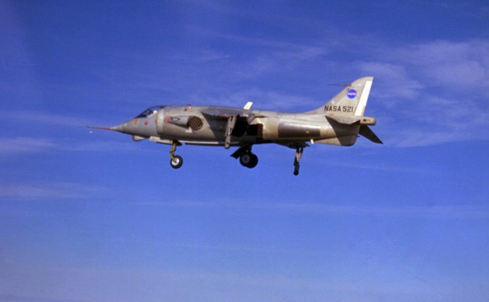 Ein Vorläufer des Harrier war die Hawker Siddeley P.1127. Hier während eines Tests im Nasa Langley Research Center. Von anderen zeitgenössischen Entwürfen unterschied sich die P.1127 darin, dass sie nur ein einziges Triebwerk besaß. Andere Typen hatten getrennte Triebwerke für Vertikal- und Horizontalflug. Das Rolls-Royce Pegasus ist ein Zweiwellen-Turbofan-Triebwerk mit Schubvektorsteuerung, bei dem die Schubrichtung über die Düsenstellung gelenkt wird.