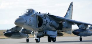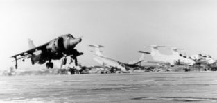 Dass der Harrier unter schwierigen Bedingungen einsetzbar war, bewies der Flugzeugtyp während des Kriegs um die Falklandinseln im Jahr 1982. Das Foto zeigt einen Harrier der Royal Air Force beim Start von Bodenblechen, mit denen die Piste für den Flugbetrieb befestigt worden war. Im Hintergrund sind argentinische Erdkampfflugzeuge vom Typ Pucara zu sehen, die bei einem britischen Kommandounternehmen zerstört worden waren.