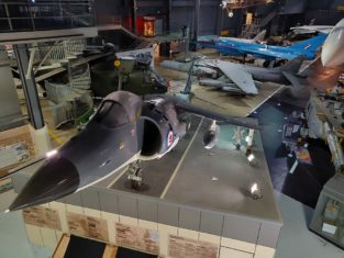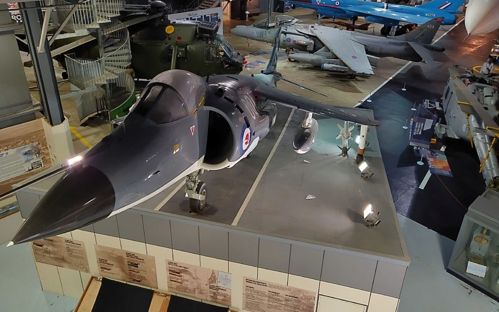 Eine Hawker Harrier FSR1 der Royal Navy im Fleet Air Arm Museum Yeovilton. Die Maschine nahm am Falklandkrieg teil. Sie steht auf einer Art Sprungschanze, wie sie auf den britischen Trägern installiert waren. Um Treibstoff zu sparen, starteten die Harrier nicht senkrecht von den Trägern, sondern nach einer kurzen Rollstrecke über diese Schanze.