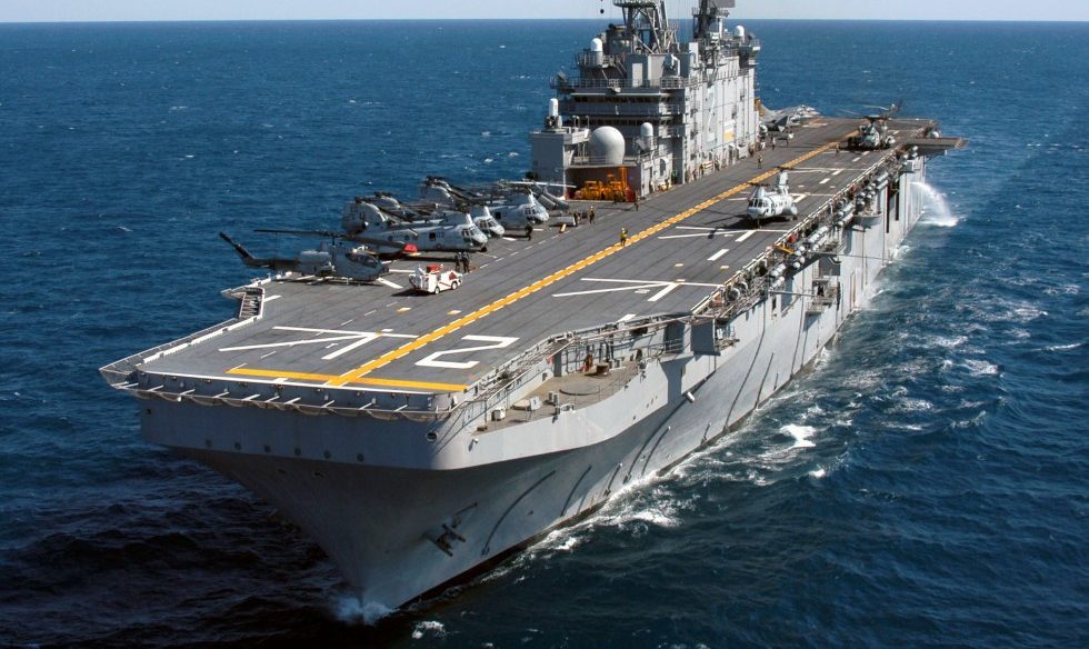 Die amphibischen Landungsschiffe der US-Marine wie hier die USS Saipan trugen außer ihren Hubschraubern auch ein Kontingent an Harrier mit sich. Diese sollten nicht nur die Marineinfanterie bei Landungen mit Luftangriffen unterstützen, sondern auch den Flottenverband vor Luftangriffen schützen.