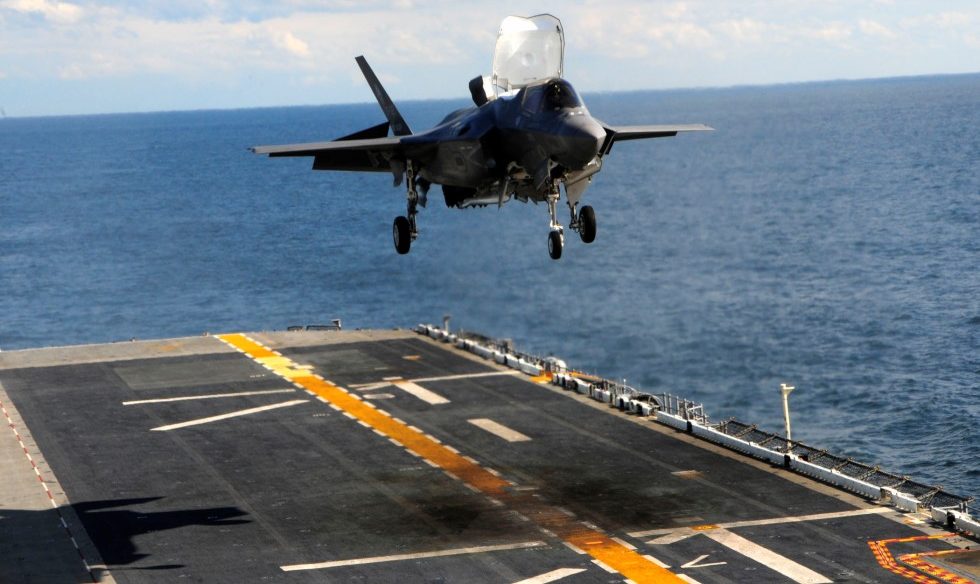 Eine F-35B Lightning II der US-Marines landet auf dem amphibischen Landungsschiff USS Wasp. Die F-35B ist als Nachfolgerin des Harrier ebenfalls ein Senkrechtstarter. Sie soll auch auf den beiden britischen Trägern zum Einsatz kommen.