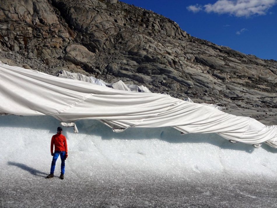 Die Gletscher sind zum Symbol für den Klimawandel geworden. Und sie sind ein Wirtschaftsfaktor, vor allem für den Skitourismus. 1993 hatte man deshalb an der Zugspitze begonnen, auf dem Nördlichen Schneeferner das Areal unter den Liften und dann auch eine Halfpipe für Snowboarder vom späten Frühjahr bis in den Herbst teilweise abzudecken. Geotextilien – in diesem Falle weiße Kunststoffbahnen – werfen das Sonnenlicht zurück, halten so den Untergrund kühl. Die Idee setzte sich auch andernorts in den Alpen durch.