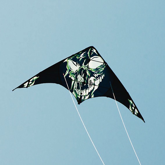 Mutet ein wenig gruselig an mit dem Totenschädelmotiv auf schwarzem Hintergrund, aber so ist der Power Hawk Skull am Himmel bestimmt nicht zu übersehen. Der Lenkdrachen kommt als kleines Kraftpaket daher mit einem 155 cm x 75 cm großen Polyestersegel und zwei 25 m langen Steuerleinen ebenfalls aus Polyester. Das Gestänge besteht aus 6 mm dünnen Fiberglasrohren. Damit ist der Falke ideal für Tage mit etwas mehr Wind mit Stärken zwischen 2 Bft. und 6 Bft, also bis knapp 50 km/h Windgeschwindigkeit. Geeignet für Einsteiger und Fortgeschrittene ab 14 Jahren. Preis: ab 22,95 €.