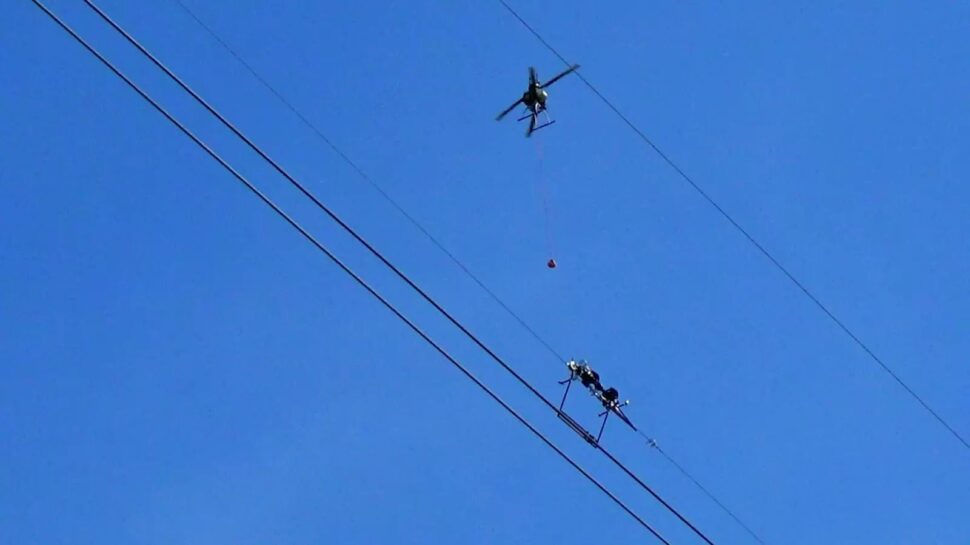 Jetzt ist der Prozess deutlich einfacher: Die Drohne setzt den Roboter auf der Leitung ab. Zwei Rollen ermöglichen es ihm, sich fortzubewegen. Ähnlich wie die Balancierstange eines Seiltänzers ist die Drohne mit Bügeln ausgestattet, die ihr Umkippen verhindern. Die Markierungsseile wickelt er in regelmäßigen Abständen um die Leitung. Dabei ist er durch eine Halteleine mit der Drohne verbunden.