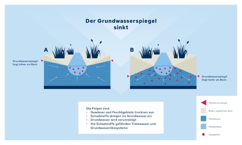 Sinkt das Grundwasser, versickern Bäche und Flüsse und verschmutzen das Trinkwasser. Grundwasser droht nicht nur weniger zu werden, sondern auch schlechter. Die Wissenschaft empfiehlt daher dringend regional abgestimmte Konzepte zur Verbesserung der Grundwasserneubildung.