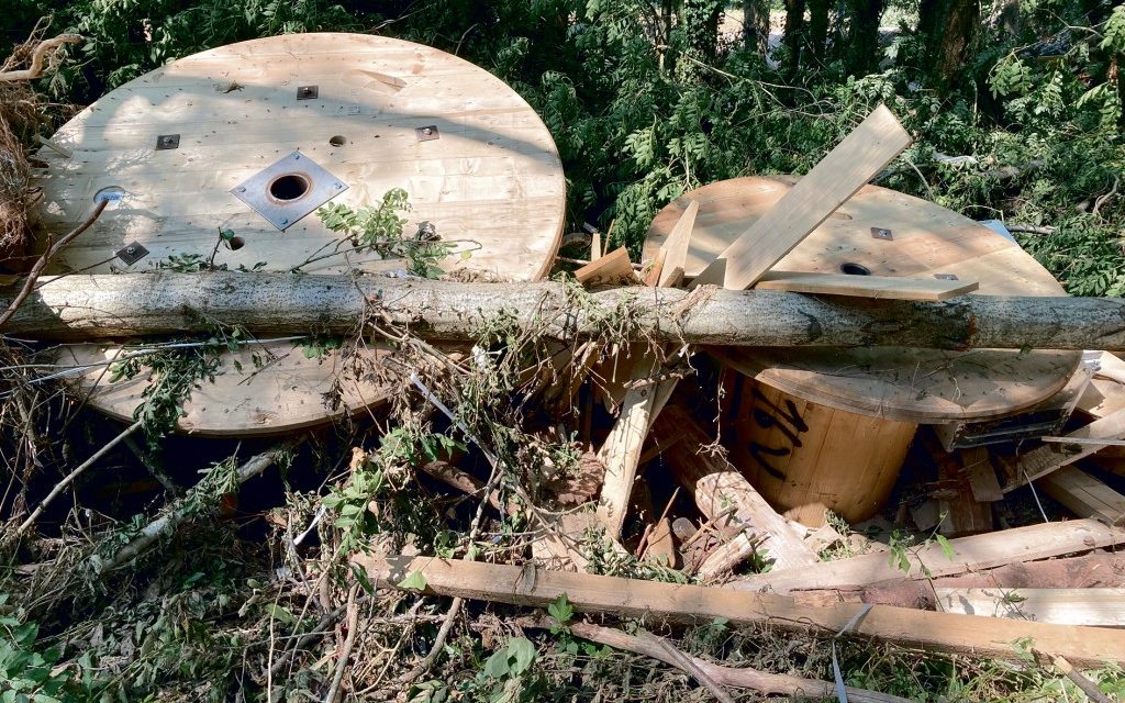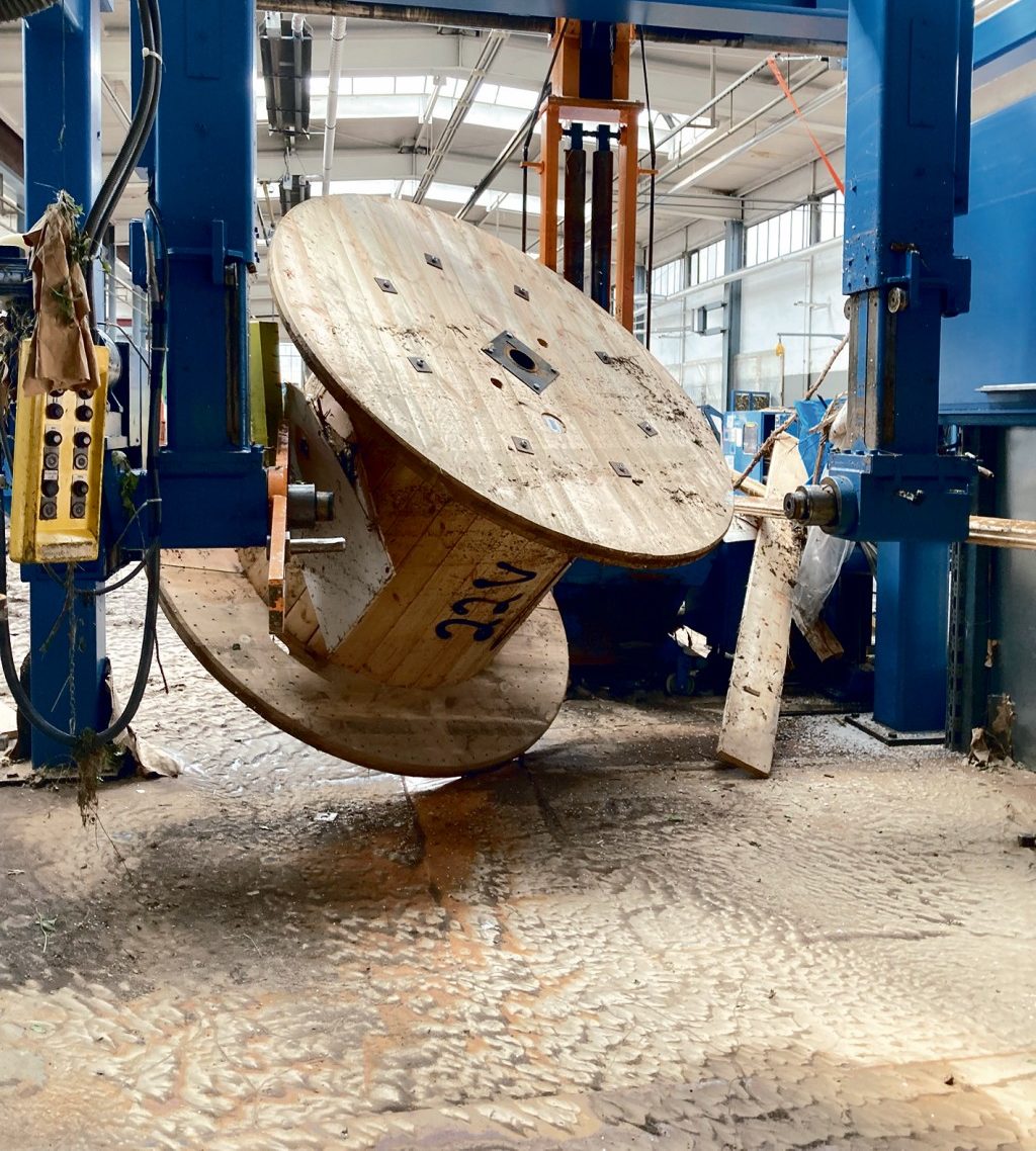 Hier werden normalerweise Kupferlitzen isoliert und zu Paaren und Aderseelen verseilt, dann geschirmt und ummantelt. Jetzt sind sie dabei, die Maschinen auszuspülen. „Die Mechanik lässt sich instand setzen, das Problem ist die Elektrik.“ Draußen stehen Kabeltrommeln mit frisch gefertigten Chargen. Sie hat die Flut mit Schlamm und Schutt überzogen und teils mit Heizöl aus dem Nachbarort Vicht kontaminiert. „Das ist jetzt alles Schrott“, sagt der Firmenchef bitter.