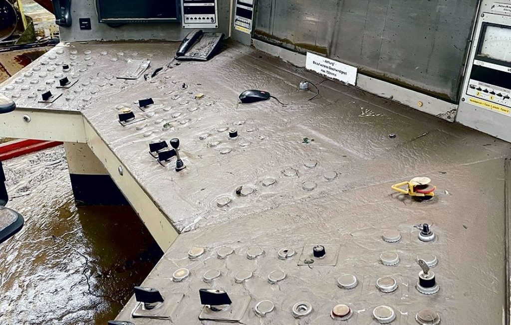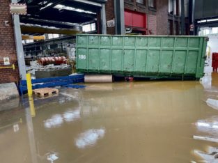 Am frühen Mittwochabend hatte sich der Pegel des Vichtbachs auf 1 m verdoppelt. Da war das THW schon vor Ort und sagte, man kann nichts mehr tun, ihr müsst weg. 40 min bekamen sie noch zur Rettung des Serverraums. Gegen Mitternacht ist der Vichtbach mit einer meterhohen „Flutwelle“ reingespült und stand 2,20 m hoch in den Gebäuden. An einer der Hallen hat das Wasser eine Geröllschicht aufgetürmt. Eine Tür mussten sie 1,5 m tief ausgraben.