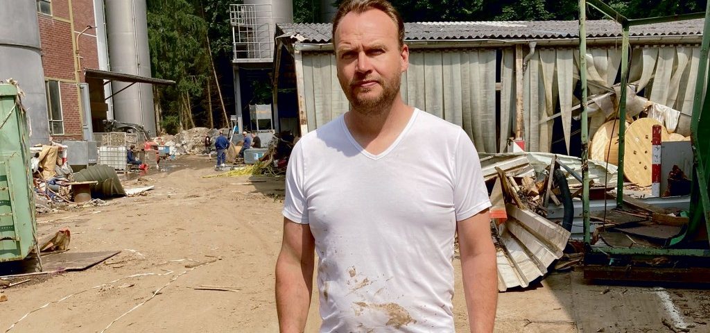 Auf dem Weg zur neuesten Fertigungshalle hellt sich sein ernster Blick auf. An einer Hochleistungsaderlinie liegen die Steuerungen im ersten Stock und sind wohl intakt geblieben. Die hofft Schlenter schnell wieder in Betrieb zu nehmen. Aufräumen, reinigen, instand setzen – was immer geht, will Schlenter zusammen mit seiner Belegschaft stemmen. „Wir wollen kämpfen, dass wir das schaffen.“ Die Mitarbeiter zögen voll mit. „Da kann man absolut stolz drauf sein.“ Um die 180 Arbeitsplätze zu erhalten, müsse aber auch der Staat helfen. Zurzeit gibt es noch Unterstützung vom Technischen Hilfswerk. „Zehn Mann, die machen einen Superjob“, sagt Schlenter dankbar.