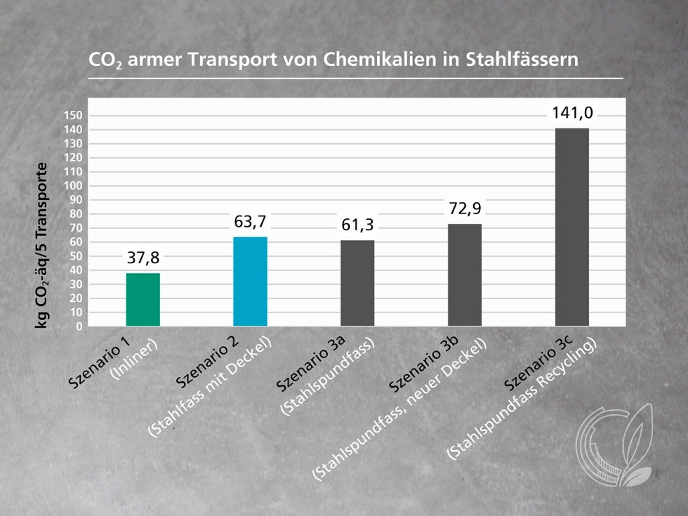 „Stahlspundfässer ohne Wiederaufbereitung emittieren dagegen 141 kg Kohlenstoffdioxid pro Betrachtungszeitraum und verursachen somit 73 % mehr Emissionen“, verdeutlicht der Wissenschaftler die erheblichen Emissionsunterschiede. Und auch im Vergleich mit den Szenarien, die ein Reconditioning berücksichtigen, lassen sich durch die Verwendung von Inlinern ca. 40 % bis 50 % der Treibhausgasemissionen einsparen.