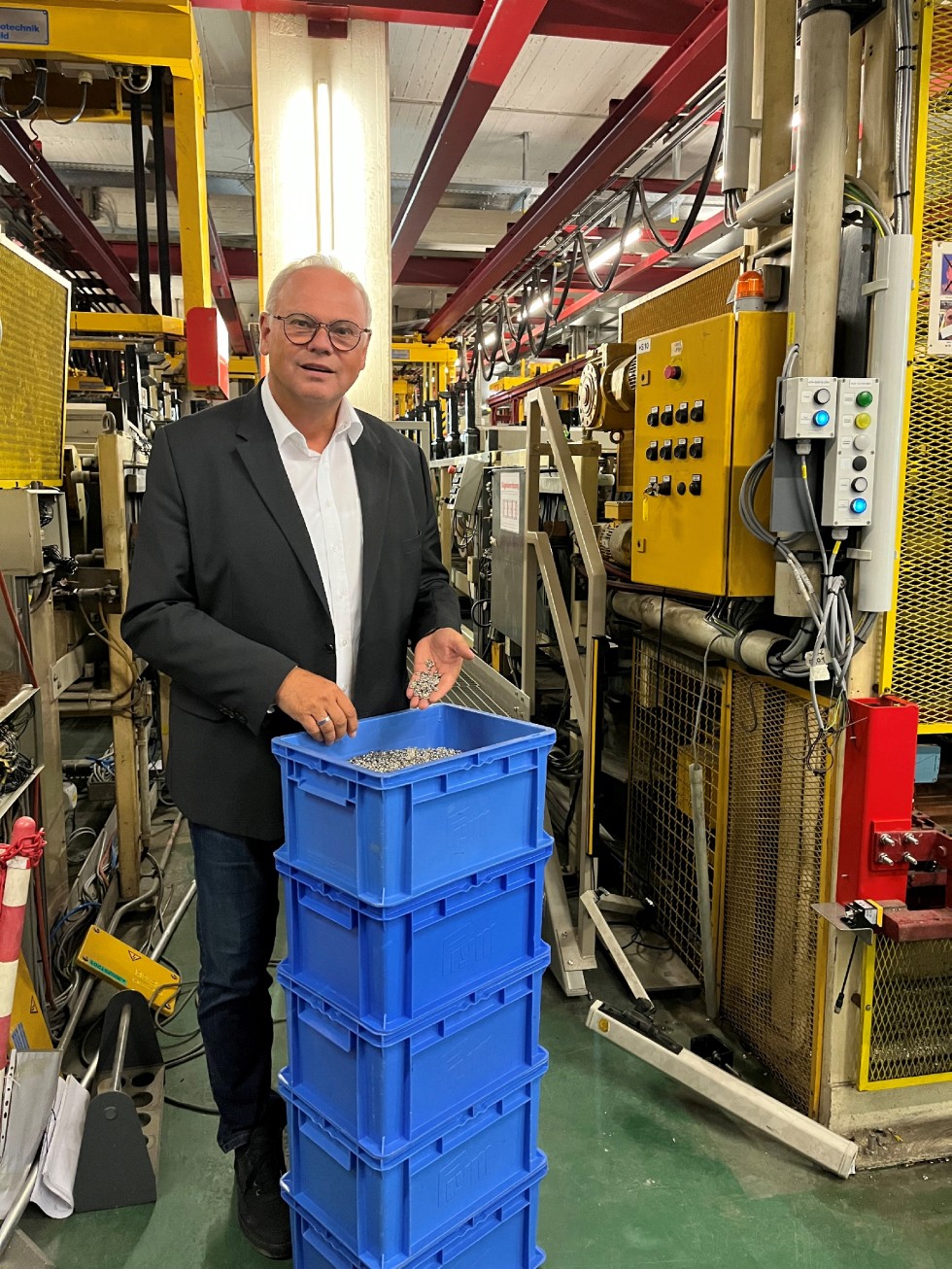 Sie läuft wieder. Axel Wirthmüller ist die Freude ins Gesicht geschrieben. Am Vortag haben sie die vollautomatische Galvanisierungsanlage wieder angefahren. Erst einmal nur im Testbetrieb. Aber die Qualität der Druckknöpfe, die hier mit Weißbronze veredelt werden, sehe schon sehr gut aus, sagt der Betriebsleiter des Geschäftsbereichs Verschlusssysteme für die Textil- und Bekleidungsindustrie bei Prym Fashion sowie des Automobilzulieferers Inovan. Noch ein paar Anpassungen, dann soll die erste von drei Produktionslinien ab Mitte dieser Woche in Produktion gehen. Im Dreischichtbetrieb werden dann wieder Druckknöpfe für Babystrampler und Oberhemden in großen Stückzahlen veredelt.