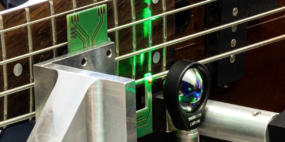 In einem anschaulichen Experiment nutzten die Forscher einen roten Diamanten als extrem empfindlichen Magnetsensor, um einen E-Bass zum Klingen zu bringen. Hierbei wird die Position der einzelnen Saiten mit sehr hoher Geschwindigkeit und Auflösung abgetastet und danach der Ton errechnet.
