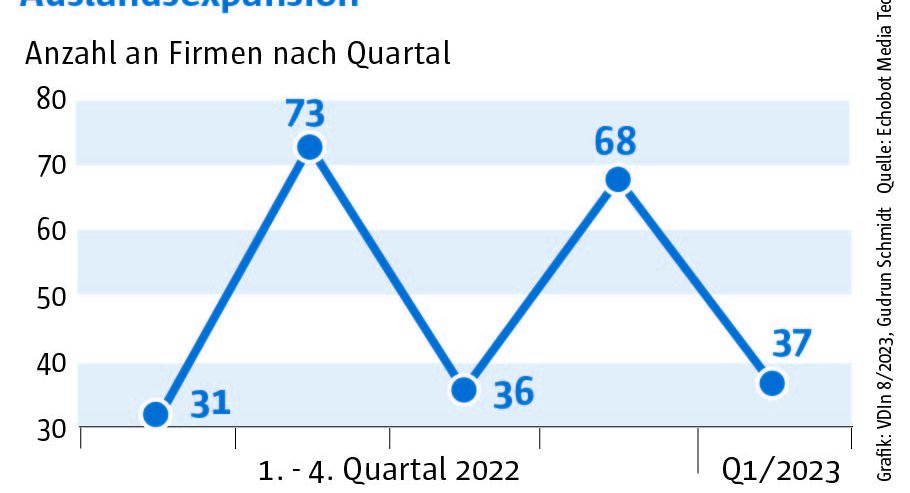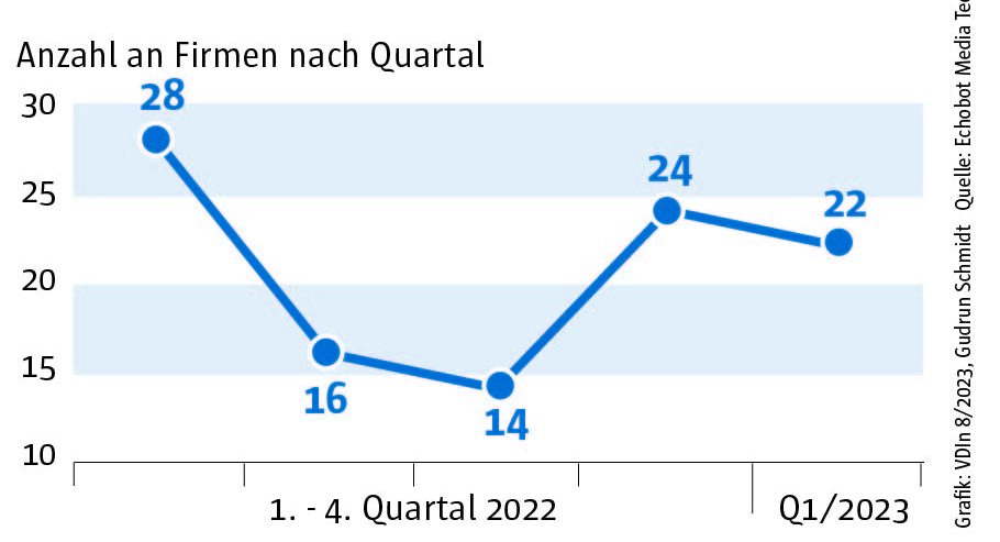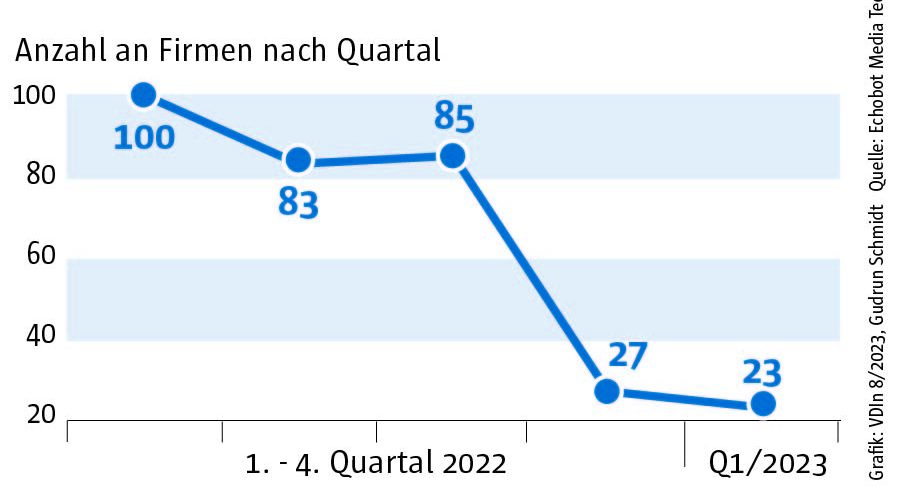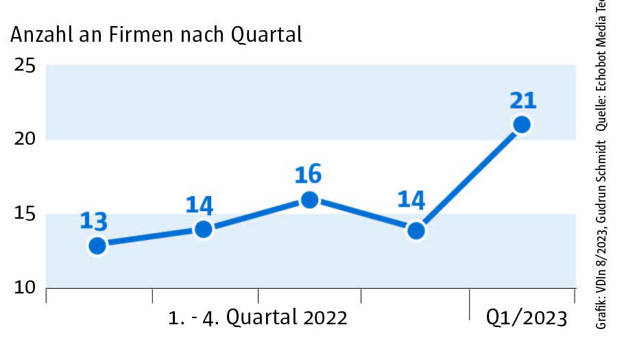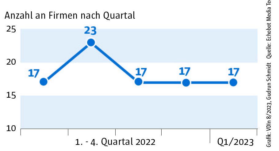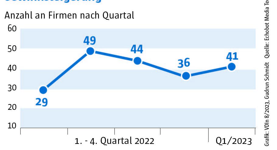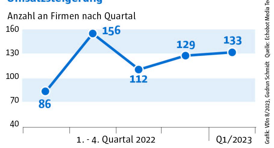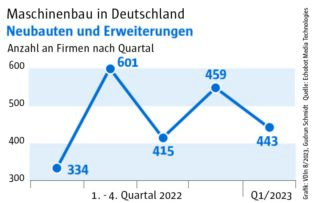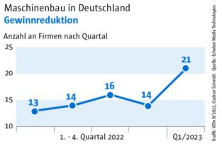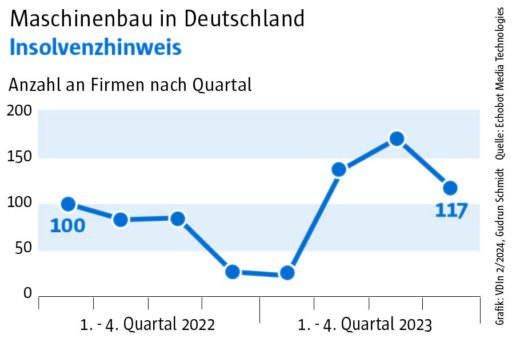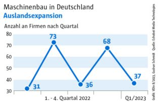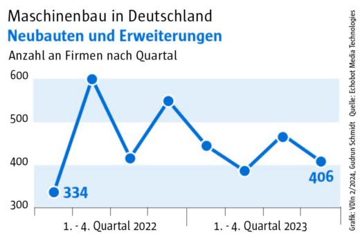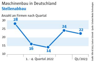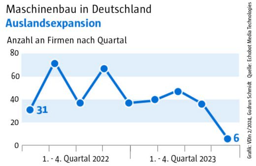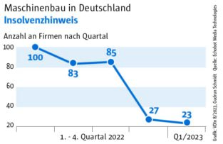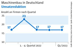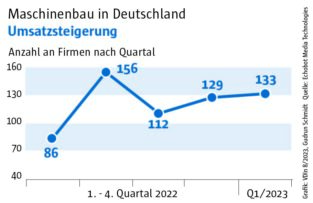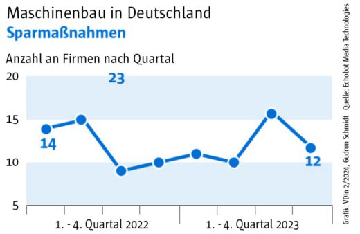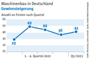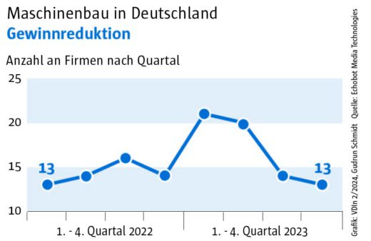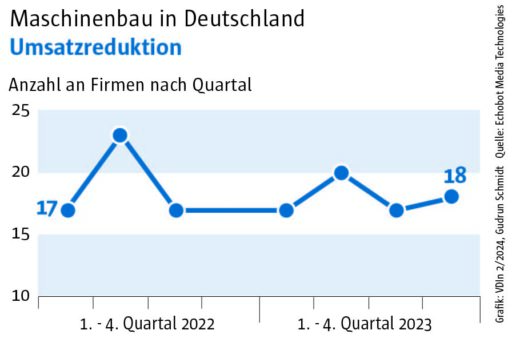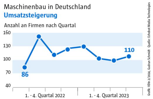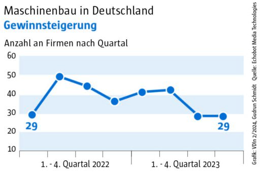 Die Auswertung des „Konjunkturechos“ ergab für das vierte Quartal 2023 einen Rückgang der Signale auf Maschinenbauer, die Gewinnsteigerungen vorweisen vorweisen können, auf nur mehr 29. Ein niedrigerer Wert wurde im Rahmen des „Konjunkturechos“ in den zwei Jahren seit Beginn der Erhebung nie gezählt. Dagegen blieb die Zahl der Unternehmen, für die Hinweise auf eine Umsatzsteigerung gefunden werden konnten, mit einem Wert von 110 ungefähr auf dem Niveau der beiden Vorquartale (Q2: 105, Q3: 100). Das legt die Vermutung nahe, dass Preisanstiege bei Vorprodukten und Gehältern nicht an die Kunden weitergegeben werden konnten.