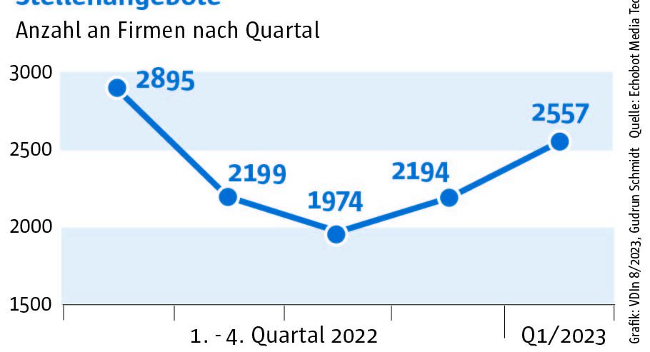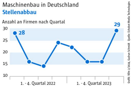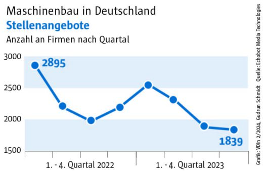 Zudem war die Zahl der Unternehmen, die im vierten Quartal offene Stellen ausgeschrieben hatten, mit 1839 vergleichsweise niedrig. Auch in diesem Fall wurde in den vergangenen zwei Jahren kein niedrigerer Wert erreicht. Damit setzt sich eine negaitive Tendenz fort, die seit dem Q1 2023 besteht. Damals suchten noch 2557 Maschinenbauer nach Personal, im Q2 waren es nur noch 2282, im Sommer 2023 bereits nur noch 1878. Passend dazu verzeichnet das „Konjunkturecho“ einen Anstieg bei den Singalen für Unternehmen, die Stellen abbauen (Q4: 29 gegenüber 16 in Q2 und Q3).