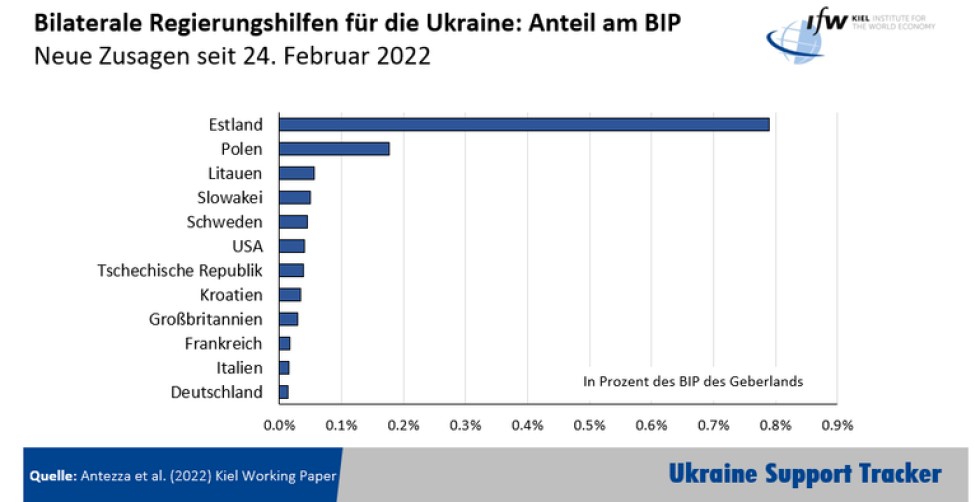 Im Verhältnis zur Wirtschaftsleistung ist Estland der größte Unterstützer der Ukraine, gefolgt von Polen und Litauen. Die USA sind hier auf dem sechsten Rang, Deutschland steht erst auf dem zwölften Rang, wobei hier indirekt über die EU geleistete Hilfen nicht enthalten sind. „Die räumliche Nähe zu Russland oder der Ukraine spielt offensichtlich eine große Rolle für das Engagement einiger osteuropäischer Länder. Aber auch Großbritannien sticht sowohl absolut wie relativ zur Wirtschaftsleistung als Unterstützer der Ukraine hervor“, so Trebesch.